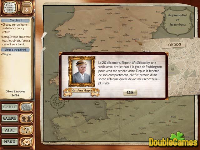 Etes-vous prêt à une nouvelle investigation ? Alors, jouez à Agatha Christie: 4:50 from Paddington, le nouveau jeu d'objets cachés, produit par I-play. Joignez-vous à Miss Marple, une petite vieille, et menez une enquête pour résoudre une affaire mystérieuse. Sa vieille amie Elspeth McGillicuddy est devenue un témoins d'un meurtre, elle a vu une femme étranglée dans le train. Elspeth demande Miss Marple d'investiguer ce meurtre etrange et effrayant. Cherchez les objets cachés, résolvez les puzzles intéressants et essayez de comprendre ce qui s'est passé et qui est coupable ? Ne manquez pas l'occasion de vous bien amuser !