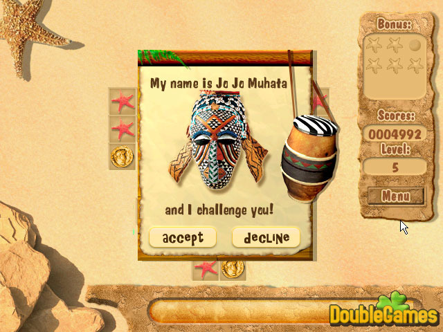 Jouissez-vous d'un temps inoubliable en passant les vacances dans des belles îles caraïbes! Un monde mystérieux d'action et d'énigme rapide et furieuse s'ouvre devant vous! Formez les rangées des objets pour purifier le tableau et vous avencer, par 100 niveaux énormes! Rassemblez des articles de bonus pour éveiller des âmes antiques comme Mutunda et Bongo et décidez d'accepter ou de décliner leur défi de résoudre une énigme de bonus. Les gagnants sont récompensés, tandis que les perdants sont punis!