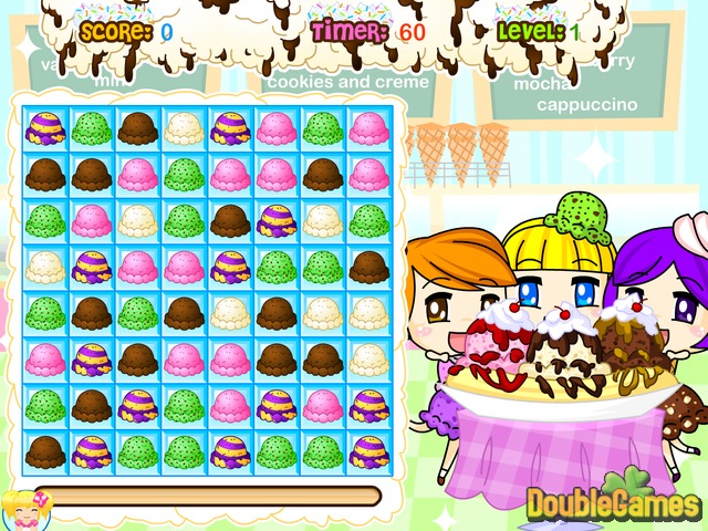 Plonger dans le monde du chocolat délicieux, l'extrait de vanille a parfumé de la glace et tous les autres genres de glace dans ce Match nouveau, coloré et mignon-3 jeu sous la Glace au Match de Shoppe de titre ! Egaler trois ou desserts plus identiques et regarde la fille mignonne mange leur glace et s'amuse ! Surmonter tous les niveaux et essayer d'obtenir autant de points comme vous pouvez ! Ce jeu est libre et fera sans aucun doute votre jour. Commencer Glace à jouer de Match de Shoppe maintenant en ligne absolument de la charge !