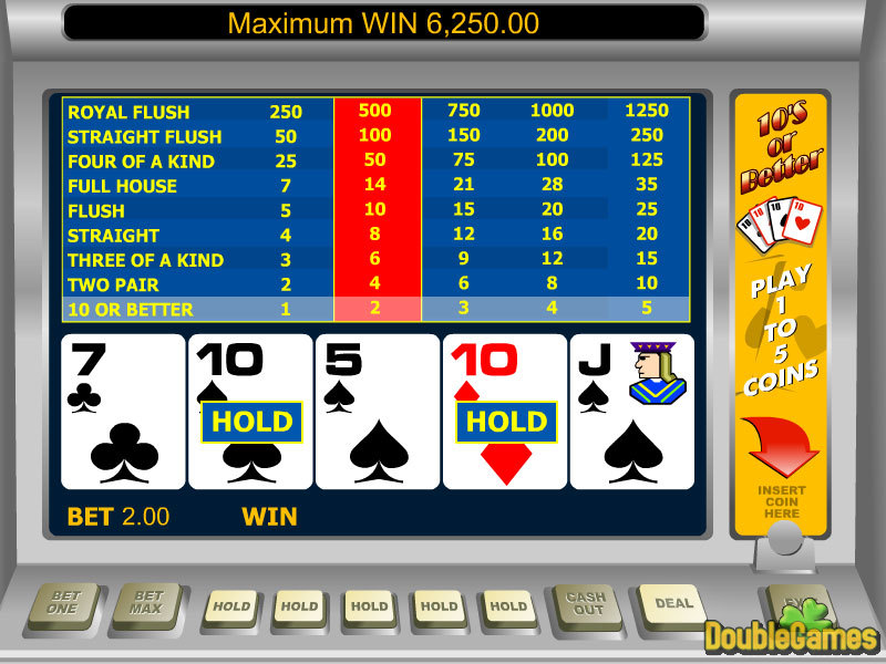 Tens or better est un jeu de casino à un seul joueur. En dessus de la machine à sous il y a le tableau des combinaisons avantageuses et des paiements. Dans la partie centale il y a l'écran où on peut voir les cartes du joueur. Au-dessous il y a trois indicateurs: la gageure courante (Bet) et la somme du gain du jeu précédent (Win). Au-dessous il y a 5 boutons "Hold" et les boutons de commande en ligne. Toutes les combinaisons sont générées d'une manière occasionnelle. Le moyen de leur rotation est aussi différent , ce qui fait le gain sur 5 lignes l'ouvrage du hasard. Nous éspérons que vous aimerez notre nouvelle machine à sous!