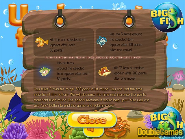 Oublier de tous vos problèmes pour une plongée de moment dans la profondeur de la mer et avoir réglé de jouer le nouveau stimuler et le jeu en ligne qui crée une dépendance Enigme de Poisson Sous-marine. Egaler des poissons colorés pour faire le rang de trois ou plus le même. Votre objectif est de gagner 300 points en cinq minutes. Comme complétant les niveaux vous aurez moins de temps et plus de points pour gagner. Démontrer vos compétences dans résoudre défiant Match 3 énigmes dans le nouveau clouer Match en ligne 3 jeu Enigme de Poisson Sous-marine. Commence à jouer ce jeu impressionnant maintenant et totalement gratis. Bonne chance !