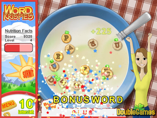 Commencez votre jour avecWord Krispies - un vrai amusement de composer des mots! 60 niveaux nutritifs défient votre cerveau pour construire des mots avant que vos lettres ne deviennent détrempées ! Il y a 10 Power-Ups de Bonus Super-amusants, y compris le Brocoli Bob, Count Alphabetica et l'Oncle Slam. Avec 6 rounds de bonus vous pouvez composer des mots plus longs pour gagner beaucoup de points! Plus, il y a un prix d'objet de collectionnement dans chaque boîte! Le petit déjeuner n'a jamais été plus amusant!