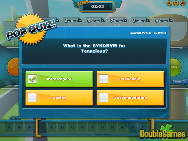 Creez votre propre énergie douce dans le nouveau jeu de mots Word Power: The Green Revolution ! Utilisez l'énergie de votre cerveau pour circonvenir les adversaires. Votre but est de lancer les entreprises d'énergie propre dans des 16 environements et devenir magnat de la production de l'énergie durable ! Téléchargez gratuitement le jeu passionnant Word Power: The Green Revolution et vérifiez vos facultés intellectuelles maintenant ! Bonne chance !